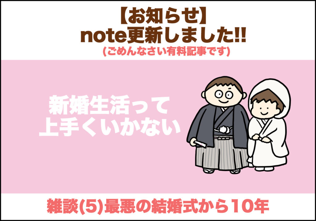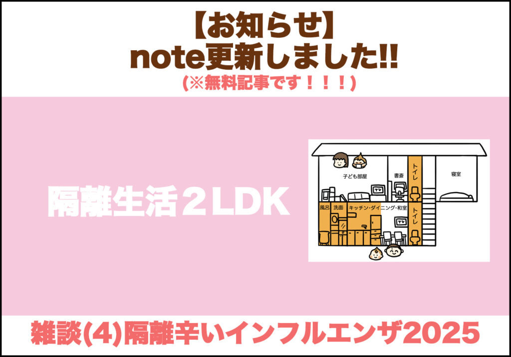 【note更新】二本立て!インフルと結婚式の話 2025 11/30 こどもの病気 家族 2025年11月30日 この話の続きです!! あわせて読みたい 我々はインフルである インフルエンザが今年もやってくる 狭い家で隔離は無理! 最初の隔離がこんな感じで、この後どうなったかと言うと… ↓↓無料記事です。文章多いですが、読んでください♪ 最悪な結婚式 目次●一人暮らしと失業●最悪なプロポーズ●前撮りで指輪●共働きの引っ越し●人生初インフルエンザ●結婚式、最大の失敗●こんなはずでは…●披露宴の返金対応 ↓↓画像タップで飛べます こどもの病気 家族 5歳10ヶ月〜就学前検診とか〜 インフルエンザの寝言 関連記事 インフルエンザの寝言 2025年12月1日 我々はインフルである 2025年11月24日 選挙の話 2025年7月31日 メガネかけたくない② 2025年5月24日 メガネかけたくない① 2025年5月22日 わかってないパパ 2025年2月21日 元気な子が学級閉鎖で…② 2024年12月31日 多様性の兄弟 2024年10月31日