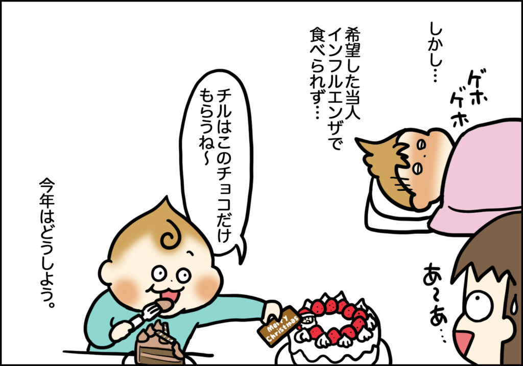 でもテルテルは、誕生日であろうとクリスマスであろうと、ホールにロウソクを立ててフーしたいそうで、カットしたケーキだと特別感がないそうです(笑)。そんなテルテルのためにホールケーキ予約したのに当日インフルエンザになり、もう予約取り消せないので夫婦で食べました。